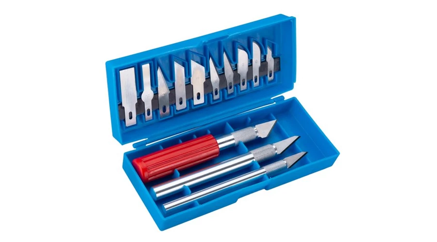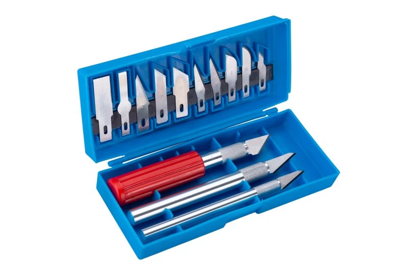 Többfunkciós szike készlet - kések, ergonomikus markolat gyorsszorító pengetartóval, széles felhasználási lehetőség modellkészítésben, faragásban, iparban, műanyag dobozban.