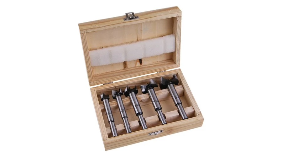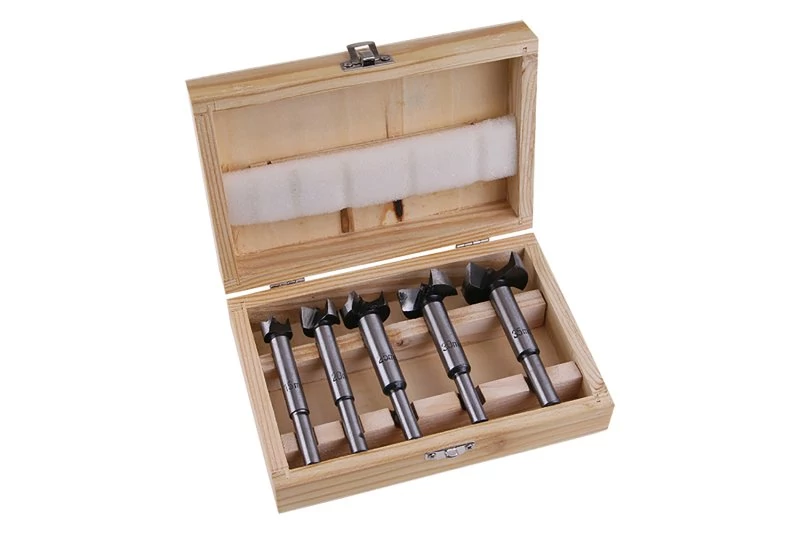 Fúrószár készlet - 5 db, kiváló minőségű szerszámacélból, precíz megmunkálás, felhasználás: nedvfúráshoz deszkákból, sima lyukak fúrásához bútorokba - pl. ajtópántokhoz, nem átjárható és átmenő furatok fúrásához kemény ill puha fa - forgácslap - rétegelt lemez, méretek: 15 - 20 - 25 - 30 - 35 mm - szár 8 mm, csomagolás: fadoboz.