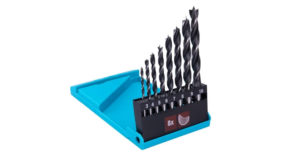 A leggyakrabban használt fúrószárak készlete 4, 5, 6, 8, 9, 10 mm-es fához, felhasználás: általános műhely- és barkácsoláshoz, fába fúrás, forgácslap, OSB panelek..., csomagolás - műanyag doboz.