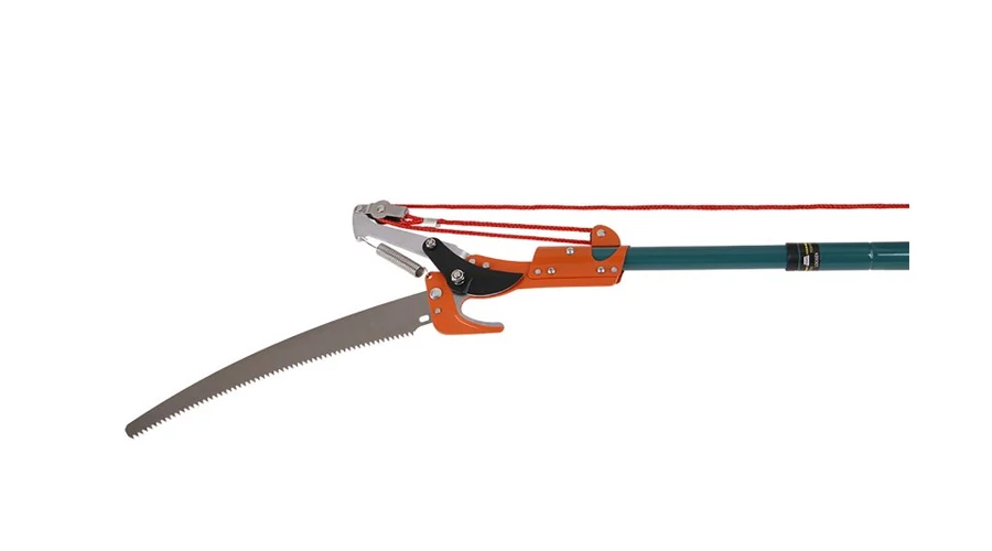 Hernyó, teleszkópos nyél, max hossz 240 cm, kerek penge tapadásmentes felületkezeléssel + 30 cm-es fűrész, felhasználás: ágak vágására, metszésére a fák koronájában, a penge fokozatvezérlése megkönnyíti a vágást.