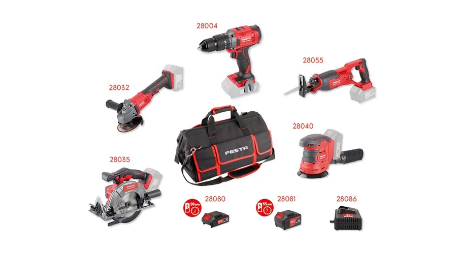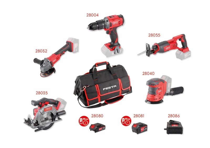 - előnyös FESTA elektromos szerszámok akkumulátorcsomag praktikus táskával ingyenes < li type="square"> a leggyakrabban használt AKU gépek készlete különféle típusú munkákhoz, a gépek a FESTA rendszer SHARE20V lehetőséggel Li-ion 2,0 Ah és 4,0 Ah akkumulátort használva minden gépben