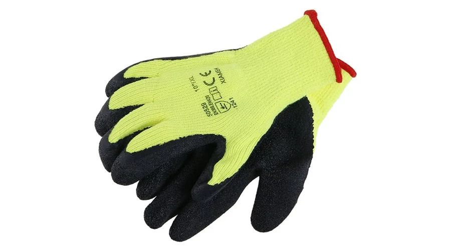 Kötött varrat nélküli akril kesztyű, fekete latex habszivacsba mártott durva tenyér, téli, CE EN 388, 10-es méret.