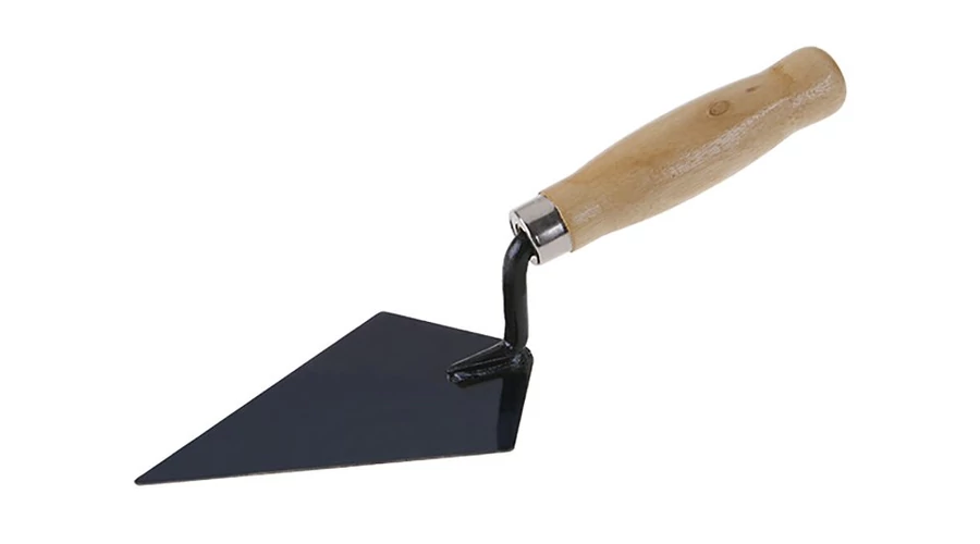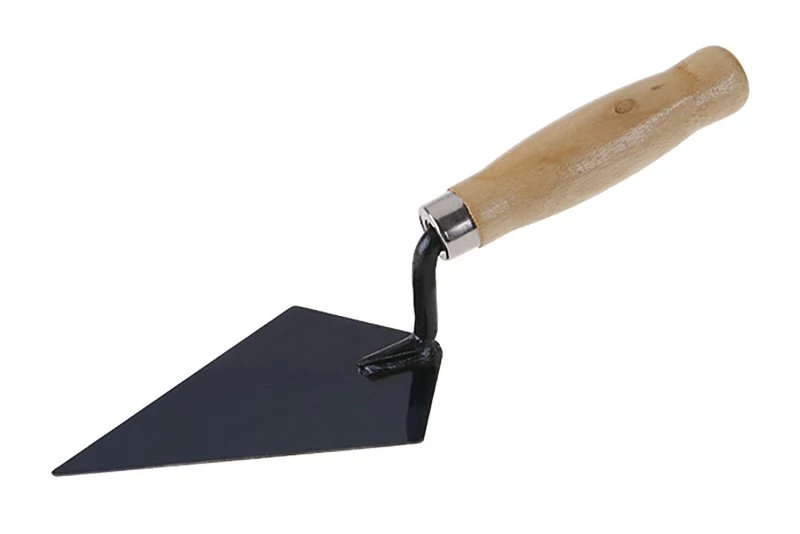 Tetőfedő kanál acél 140 x 85 mm, fa nyéllel. A kanál acélból készült, a nyél fából készült, lakkozott felülettel. Falazott acél simító tetőfedők számára.