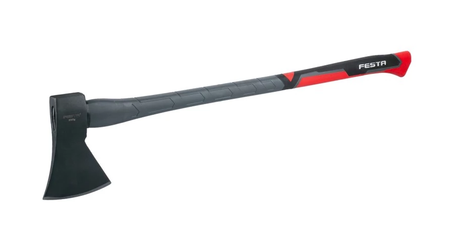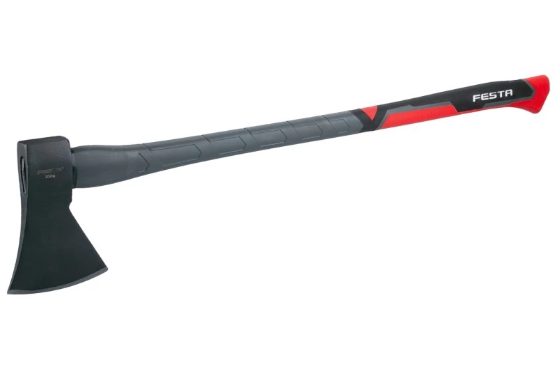 2000g ÜVEGSZÁLAS FESTA fejsze ütéselnyelő üvegszálas nyéllel. A fogantyú csúszásmentes fogantyúval rendelkezik, a végén hosszabbítóval, amely megakadályozza a csúszást. A gyakorlatban a fejszét főként fa aprítására vagy faragására, fák kivágására használják.