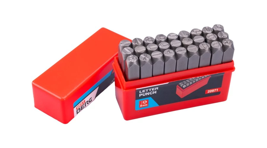 Kézi lyukasztó - ábécé betűi, kiváló minőségű szénacél - szilárdság 800 N/mm2-ig, zavaros csúcsok - nagy keménység, méretek: betűmagasság - 8 mm, karaktertípusok DIN 1451 szerint, csomagolás: műanyag doboz.