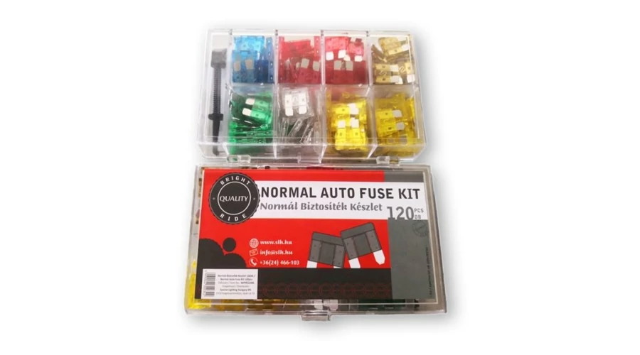 Normál méretű késes biztosíték szett, 120 darabos műanyag tárolódobozban. A készlet tartalmaz biztosíték csipeszt is. Tartalma: