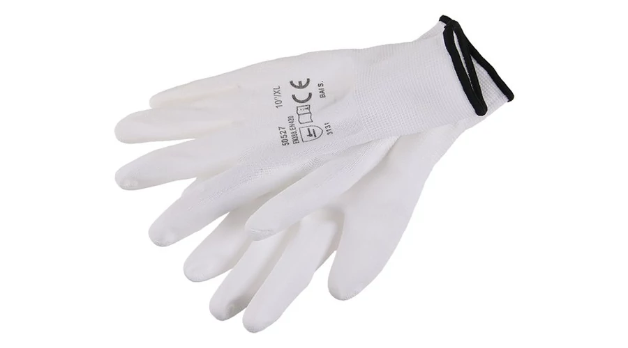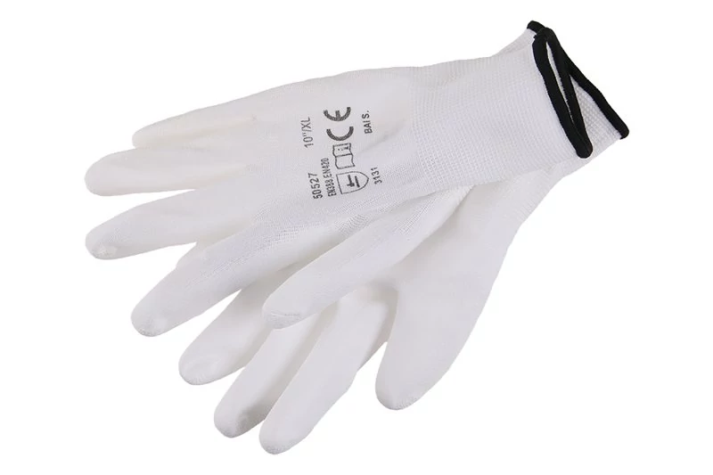 Fehér kötött finom nylonból, poliuretán réteggel mártva, CE EN 388, 10-es méret.