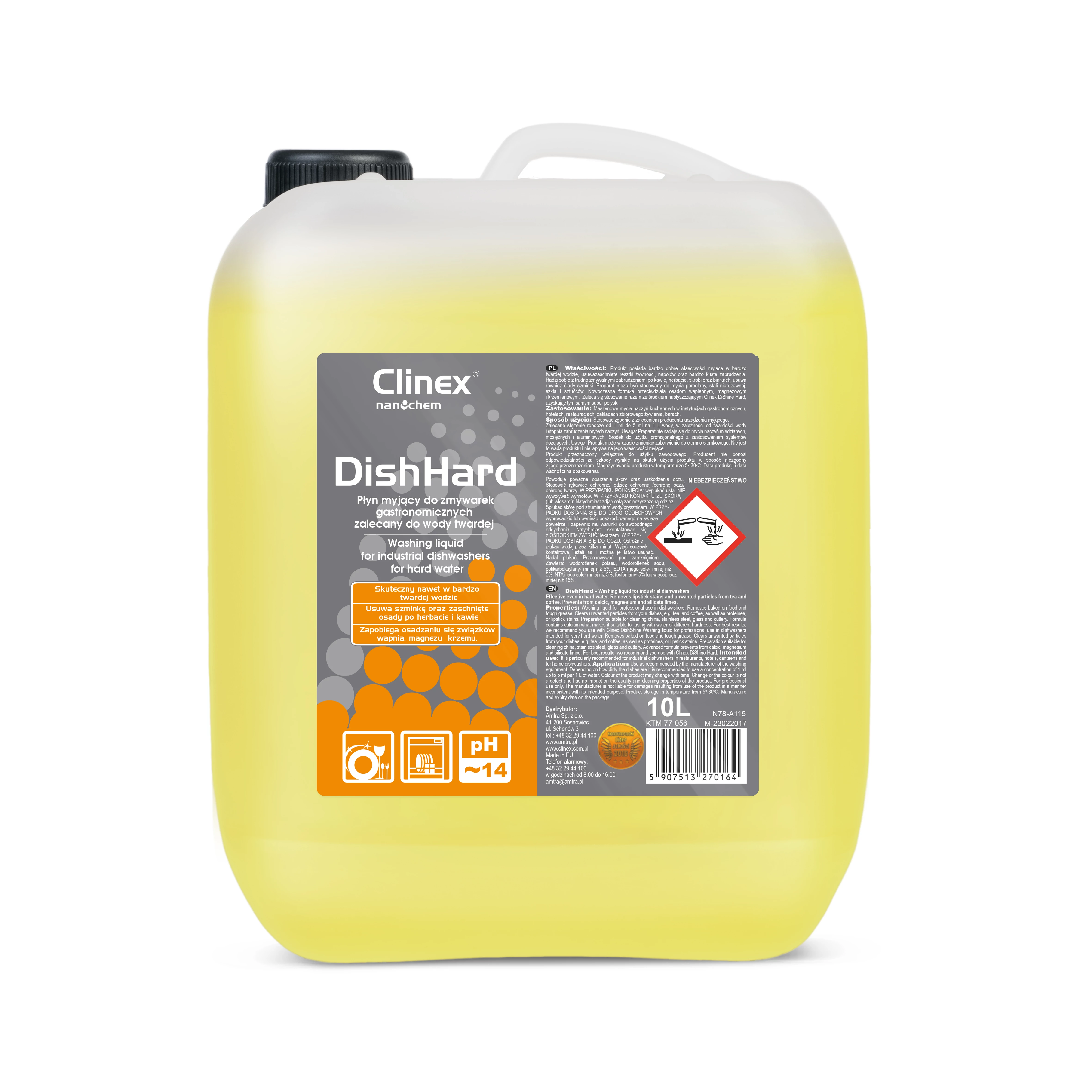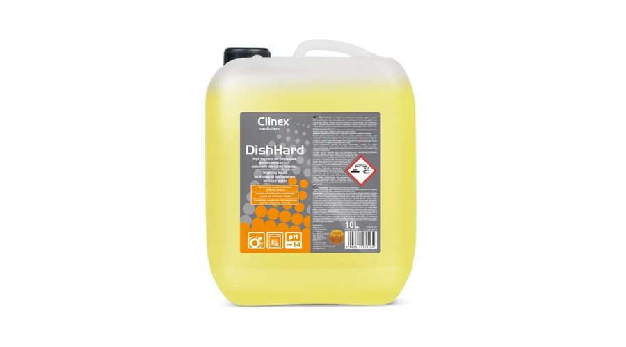 Mosogatószer ipari felhasználásra nagyon kemény vízhez. Foszfát és klórmentes. Eltávolítja a rúzsfoltokat, fehérjéket, tea és kávé maradványokat. Megóv a vízkő és szilikát vegyületek lerakódása ellen. Eltávolítja a beégett és makacs zsírokat. Alkalmas porcelán, rozsdamentes acél, üveg és evőeszközök tisztítására. A legjobb eredmény érdekében használja a Clinex ShineHard termékkel. Felhasználási javaslat: Használata különösen éttermek, hotelek, étkezdék nagyüzemi mosogató gépeihez, valamint háztartási mosogatógépekhez ajánlott. Használati útmutató: A mosgatógép gyártójának javaslata szerint. A szennyeződés mértékétől függően a javasolt hígítás: 1-5 ml termék/1o l víz. Idővel a termék színe változhat. A színváltozás nem hat ki a termék minőségére, tisztító hatására A gyártó és forgalmazó nem vonható felelősségre a nem rendeltetésszerű használatból eredő károkért. Optimális tárolási hőmérséklet: 5-30°C. Gyártási és eltarthatósági idő: lásd csomagolás. Kizárólag professzionális felhasználásra. VESZÉLY Tartalmaz: Kálium-hidroxid, Nátrium hidroxid. Súlyos égési sérülést és szemkárosodást okoz. A gőzök/ permet belélegzése tilos. Védőkesztyű/védőruha/ szemvédő/arcvédő használata kötelező. LENYELÉS ESETÉN: a szájat ki kell öblíteni. TILOS hánytatni. HA BŐRRE (vagy hajra) KERÜL: Az összes szennyezett ruhadarabot azonnal el kell távolítani/le kell vetni. A bőrt le kell öblíteni vízzel/zuhanyozás. BELÉLEGZÉS ESETÉN: Az érintett személyt friss levegőre kell vinni és olyan nyugalomi testhelyzetbe kell helyezni, hogy könnyen tudjon lélegezni. SZEMBE KERÜLÉS esetén: Több percig tartó óvatos öblítés vízzel. Adott esetben a kontaktlencsék eltávolítása, ha könnyen megoldható. Az öblítés folytatása. Elzárva tárolandó. Összetétel kategóriák: 5-<15% foszfonátok, < 5% EDTA és annak sói.