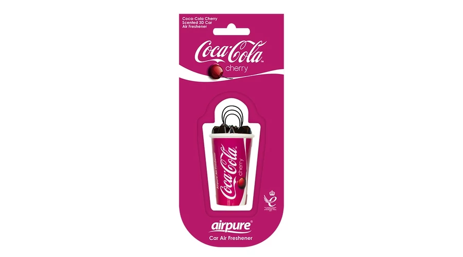A 3D-s pohár alakú Airflair Coca-Cola Cherry légfrissítő másodpercek alatt felfrissíti a levegőt, és a laza Coca-Cola életstílust hozza el az autóba.