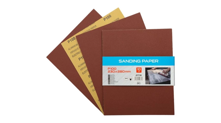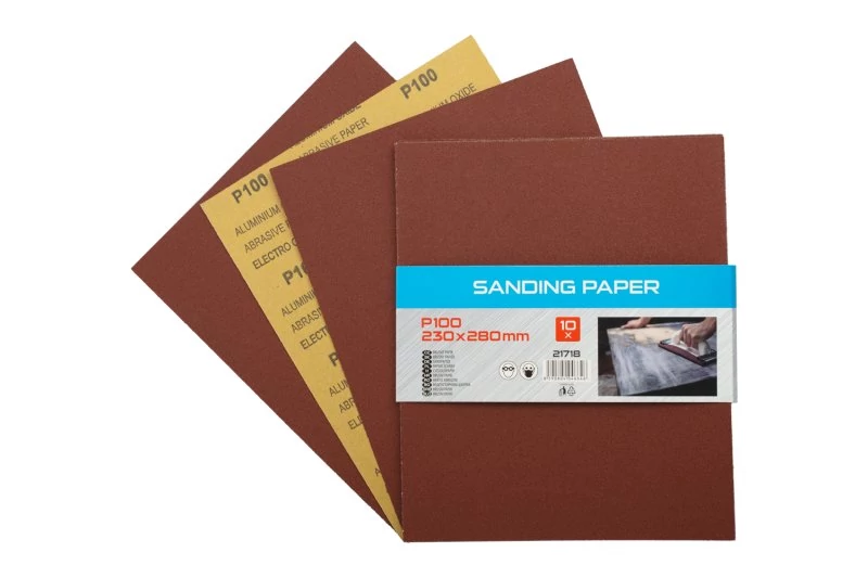 Csiszolópapír - 10 darabos készlet, szemcse: 100 szemcse, kötőanyag: műgyanta, hátlap anyaga: rugalmas papír C (110-135g/m2), méretek: a termék megnevezésében feltüntetve, csomagolás: 10 db - papír hüvely.