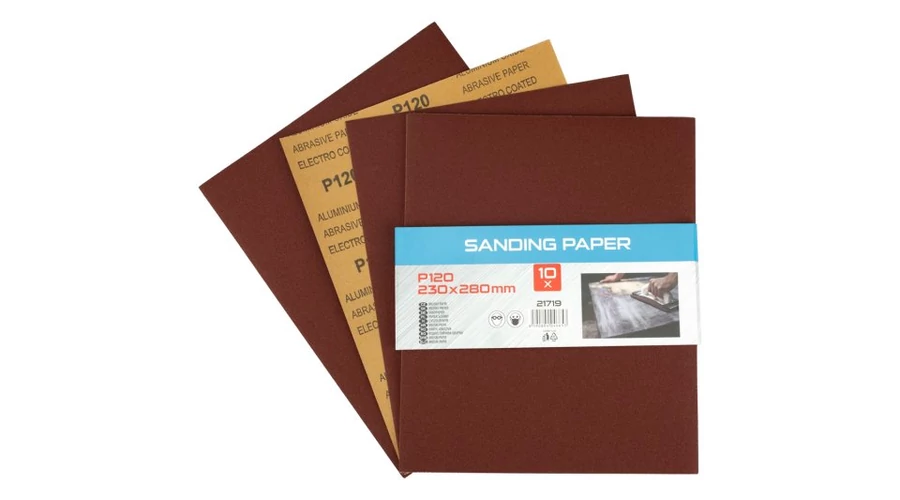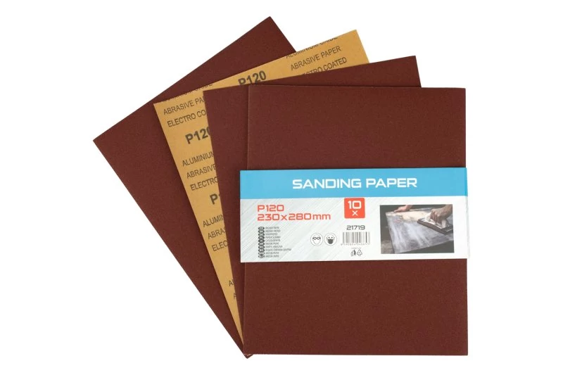 Csiszolópapír - 10 db-os készlet, szemcse: 120, szemcse típusa: alumínium-oxid, kötőanyag: műgyanta, alapanyag: rugalmas papír C (110-135g/m2), méretek: a termék megnevezésében feltüntetve, kiszerelés: 10 db - papír hüvely.