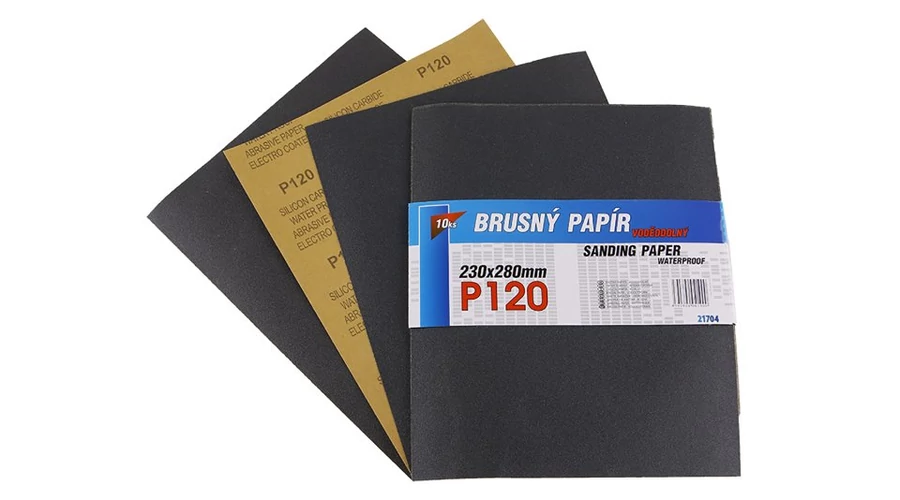 Vízálló csiszolópapír - 10 darabos készlet, szemcseméret: 120, szemcsetípus: szilícium-karbid, kötőanyag: vízálló műgyanta, hátlap anyaga: rugalmas vízálló papír C (110-135g/m2), méretek: a termék megnevezésében feltüntetve, csomagolás: 10 darabok - papírhüvely.