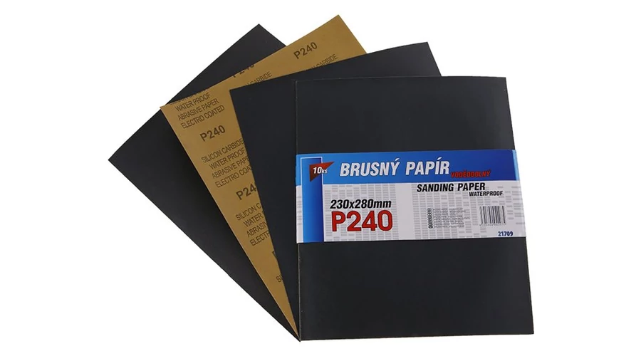 Vízálló csiszolópapír - 10 darabos készlet, szemcseméret: 240, szemcsetípus: szilícium-karbid, kötőanyag: vízálló műgyanta, hátlap anyaga: rugalmas vízálló papír C (110-135g/m2), méretek: a termék megnevezésében feltüntetve, csomagolás: 10 darabok - papírhüvely.