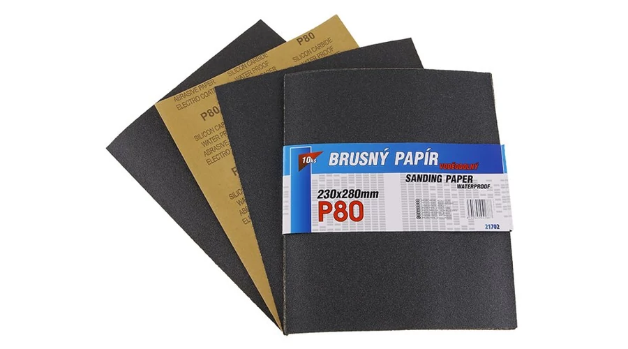 Vízálló csiszolópapír - 10 darabos készlet, szemcseméret: 80, szemcsetípus: szilícium-karbid, kötőanyag: vízálló műgyanta, hátlap anyaga: rugalmas vízálló papír C (110-135g/m2), méretek: a termék megnevezésében feltüntetve, csomagolás: 10 darabok - papírhüvely.