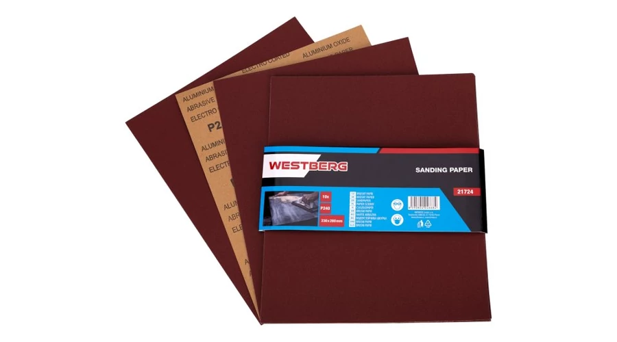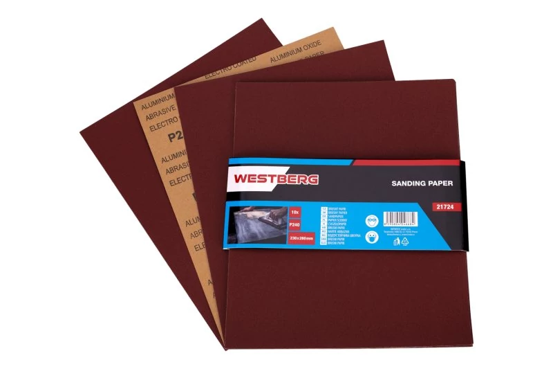 Csiszolópapír - 10 darabos készlet, szemcseméret: 240, szemcsefajta: alumínium-oxid, kötőanyag: műgyanta, alapanyag: rugalmas papír C (110-135g/m2), méretek: a termék megnevezésében feltüntetve, kiszerelés: 10 db - papír hüvely.