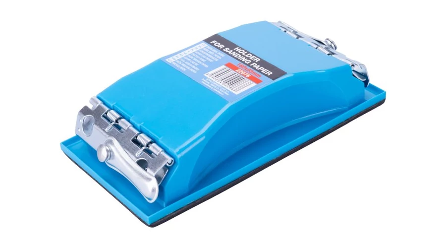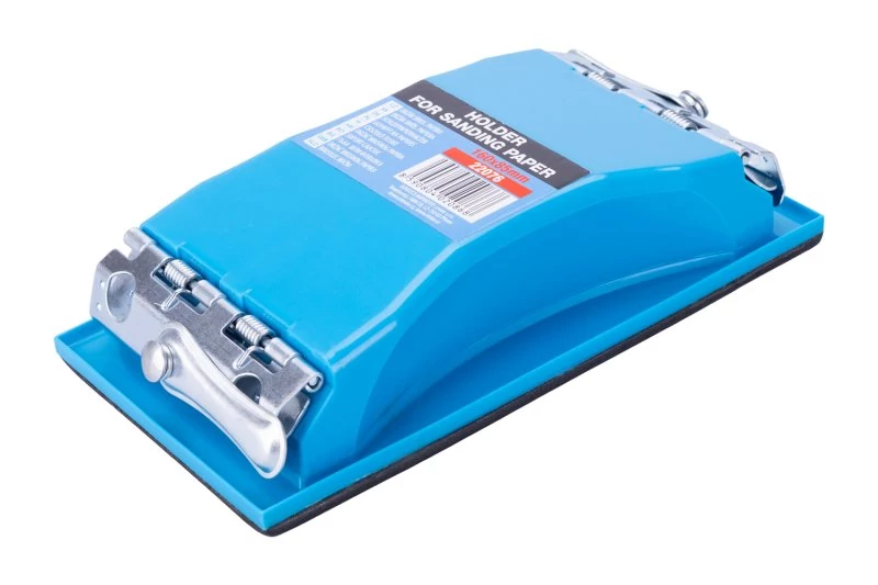 Csiszolópapír tartó, anyaga: műanyag - fém - gumi, ergonomikus forma a könnyű fogásért és munkavégzésért, a kiváló minőségű rugós zárak könnyű cserét és papír, tányérok vagy csiszolórácsok megfelelő megtartását teszik lehetővé, a gumiréteg biztosítja a jó alkalmazkodást a csiszolt felülethez, használat : csiszolópapír tartó, kendők, csiszoló rácsok,..., méretek: a termék megnevezésében szerepel.