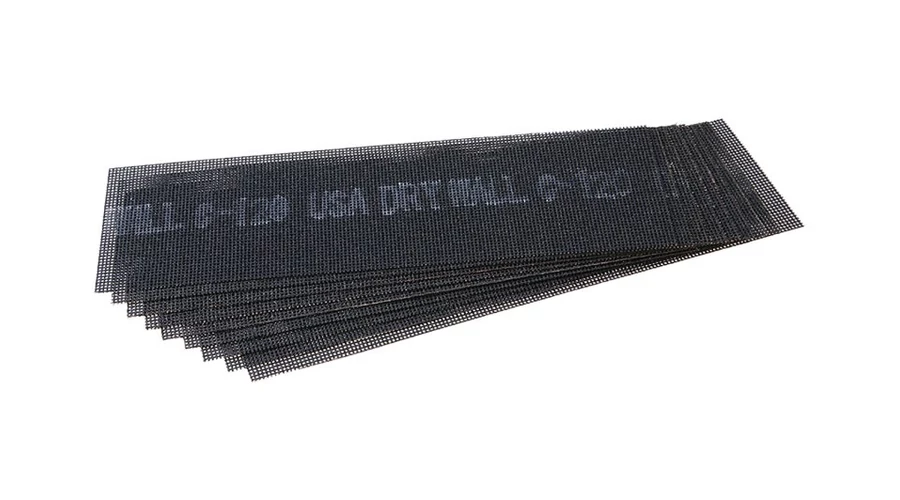 Csiszolőrács 93 x 290 mm, szemcse 120, 10 db/készlet. , üvegszálból készült tartószövet, szilícium-karbid gyantával ragasztott csiszolószemcsék antisztatikus bevonattal, alkalmas gipszkarton hézagoló keverékek és egyéb anyagok csiszolására, a rácsszerkezet előnye a hagyományos csiszolópapírokhoz képest, hogy nem tömődik el a csiszolt anyaggal .