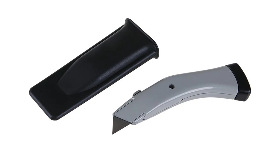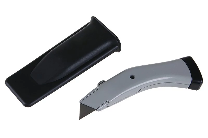 Fém kés visszahúzható trapéz pengével, a kés testén belül csúsztatható csúszkán rögzített penge, ergonomikus forma, kétállású láb lehetővé teszi a penge egyszerű szétszedését és cseréjét, műanyag tok övcsipesszel.