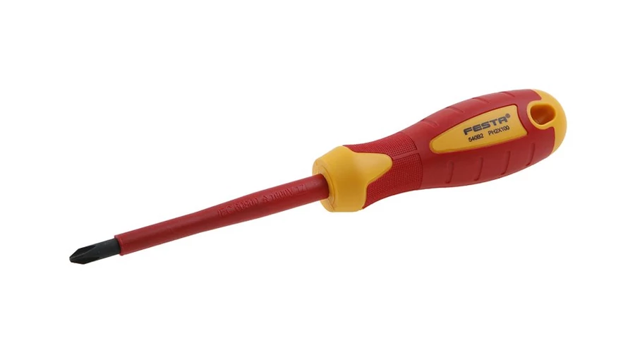 A FESTA csavarhúzó elektromos VDE 1000 V, EN IEC 60900:2018 minősítéssel rendelkezik, fém tengelye kiváló minőségű króm-vanádium acélból készült, edzett hegye mágneses, az ergonomikusan kialakított nyélen a polipropilén és a gumi kombinációja garantálja a kiváló anti- csúszási tulajdonságok és jó kenőanyagokkal és vegyszerekkel szembeni ellenállás.