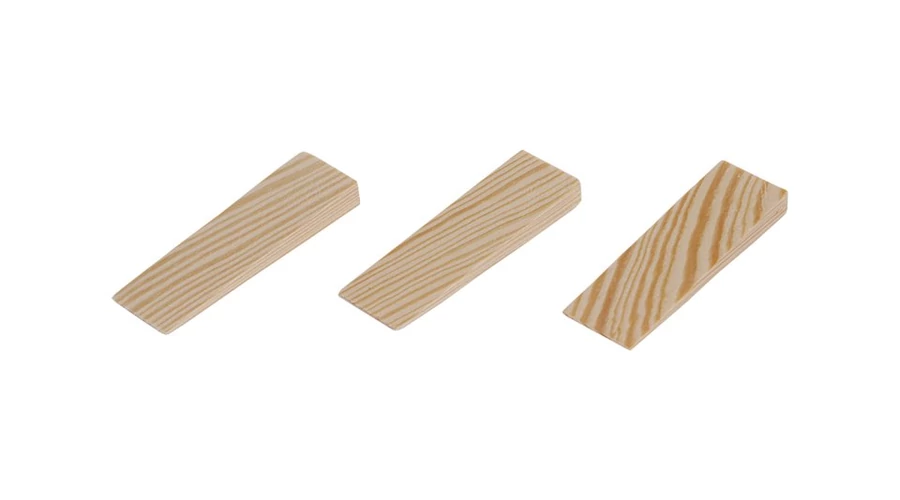 Fa ékek (luc), méret: 80 x 25 x 3-10 mm, mennyiség: 20 db, felhasználás: ablakok, ajtókeretek és fémszerkezetek beépítéséhez, csomagolás: Euro lyukkal ellátott buborékfólia.