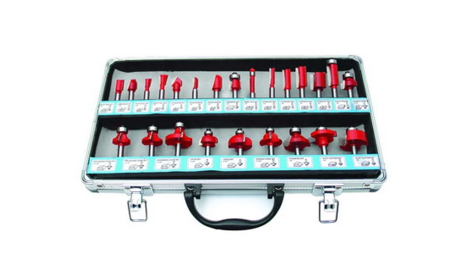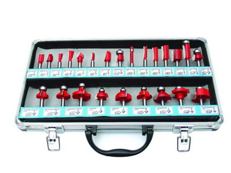 Formavágók fához - 24 db-os készlet, a marók kiváló minőségű SK pengével, különféle típusú vezetőkerék nélküli vagy vezetőkerék nélküli formavágókkal és kiváló minőségű csapággyal vannak felszerelve, felhasználás: különböző formájú hornyok és élek marásához, szár 8 mm, csomagolás: tartós alumínium tok.