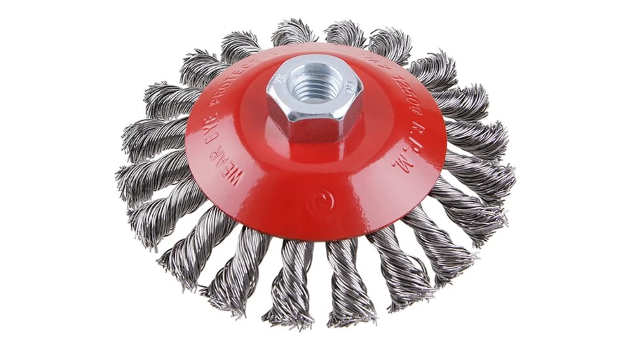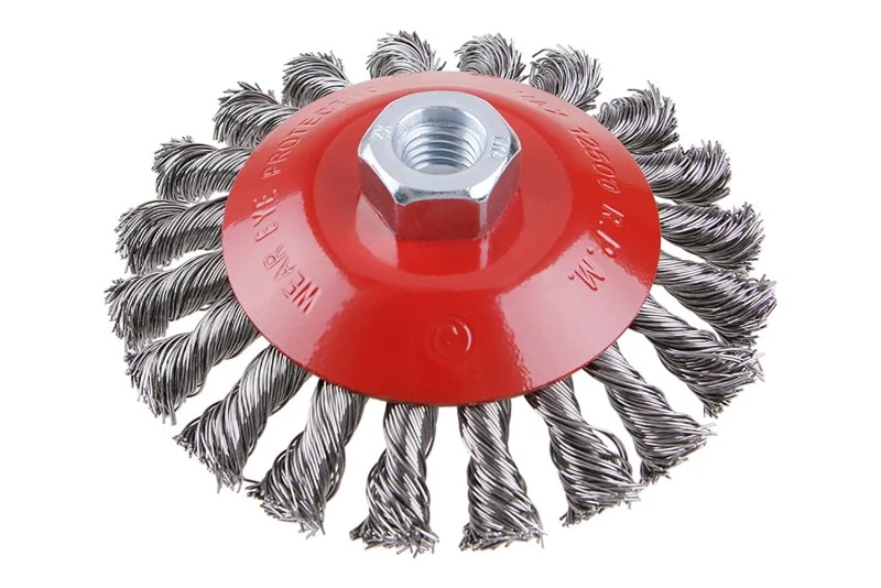 Forgókefe - csésze, kivitel: COPY - szabadalmaztatott huzal 0,5 mm - másolás, extrém terhelés mellett sem bontható ki, átmérő 115 mm, menet M14x2 mm, huzalok száma: 900, huzalhossz: 23 mm, megengedett fordulatszám: 12500 1 /perc, felhasználás: festék, rozsda, sorja, hegesztési maradványok, salak eltávolítása, érdesítés, fém alkatrészek tisztítása