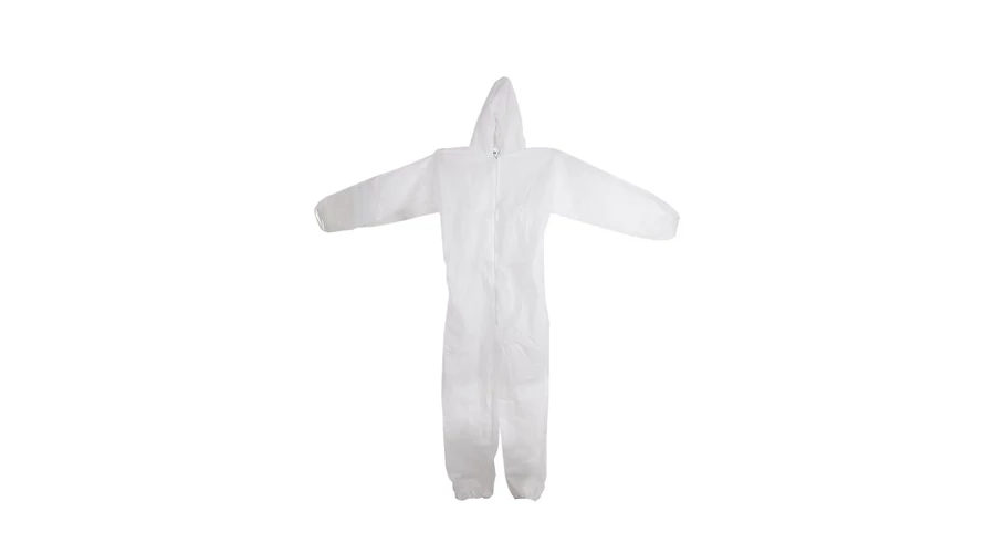 Jumpsuit elasztikus kapucnival, rugalmas mandzsettával és derékkal, cipzárral, polipropilén 40 g/m, fehér szín, XL-es méret.