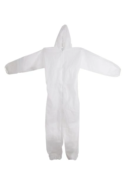 Jumpsuit elasztikus kapucnival, rugalmas mandzsettával és derékkal, cipzárral, polipropilén 40 g/m, fehér szín, XXL méret.