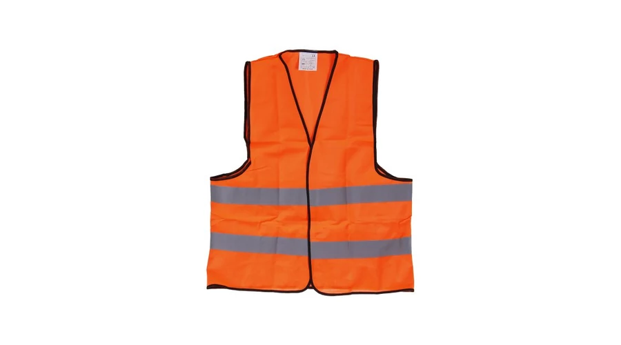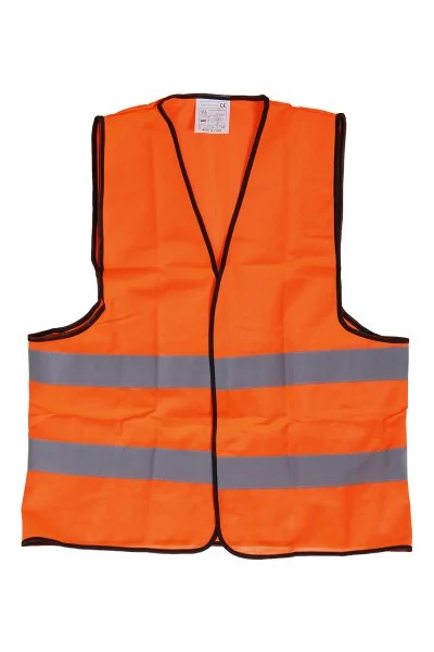 Narancssárga poliészter sztreccs mellény, 2 vízszintes fényvisszaverő csík, tépőzáras, UNI méret, CE EN 471.