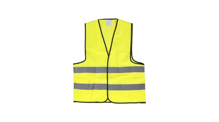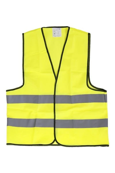 Sárga poliészter figyelmeztető mellény, 2 vízszintes fényvisszaverő csík, tépőzáras, UNI, CE EN 471 méret.