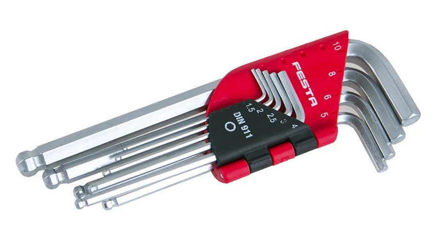 A leggyakrabban használt méretű FESTA imbuszkulcsok (imbuszkulcsok) készlete minőségi króm-vanádium acélból, végig edzett, szabványos hosszúság praktikus zárótokban, a golyó ± 25°-os szögben is használható.