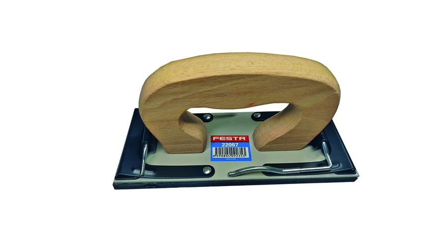 Professzionális kézi tartó csiszolóanyagokhoz - vásznak, papírok, rácsok. A nyél kiváló minőségű bükkfából készült, a nyél megmunkálása és formája a kéz optimális dőlésszögéhez igazodik csiszoláskor, így minimális erőfeszítéssel egyenletes nyomás éri a teljes csiszolófelületet, gyors és egyszerű csere csiszolóanyag, erős markolat. A munkafelület gumija lehetővé teszi a csiszolt felület jó alkalmazkodását és másolását. Méretei 17 * 7 cm.