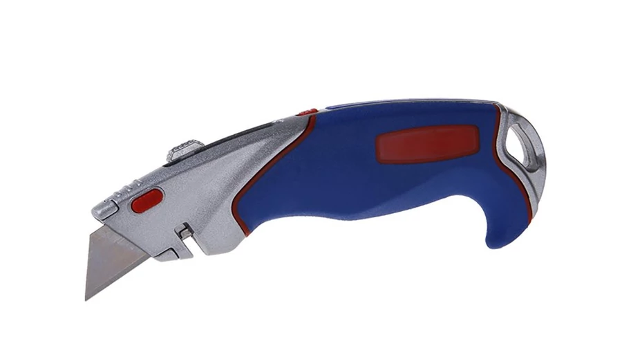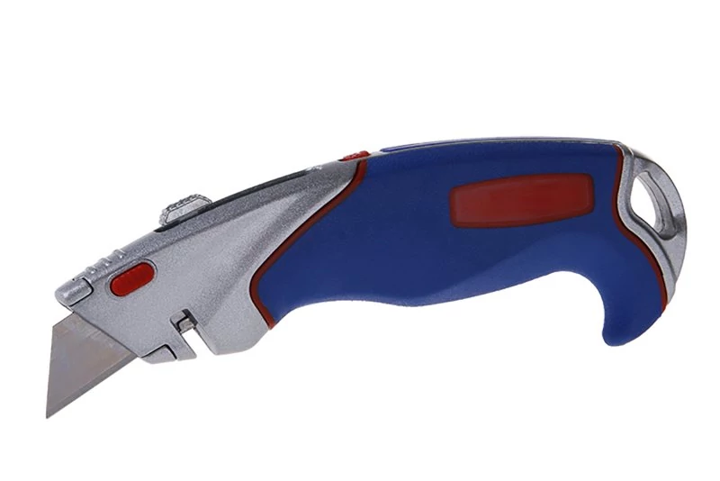 Fém kés visszahúzható trapéz pengével, késtest belsejében csúsztatható csúszkán rögzített penge, ergonomikus forma, gomb a könnyű és gyors pengecseréhez, húrvágó horony, huzalcsupaszítás..., 2 tartalék penge.