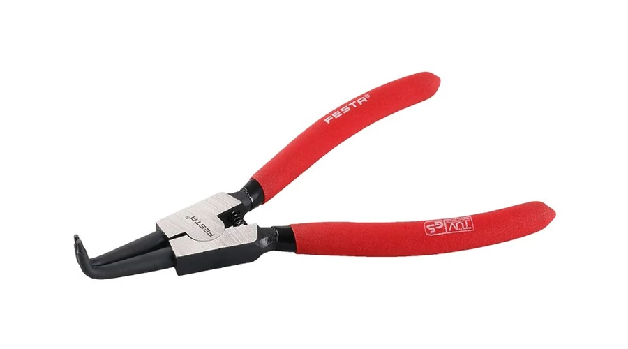 íves kivitelű külső biztosítógyűrűs fogó, biztosítógyűrűk be- és leszerelésére szolgál, csapágyak rögzítésére használhatjuk tengelyeken vagy furatokon.