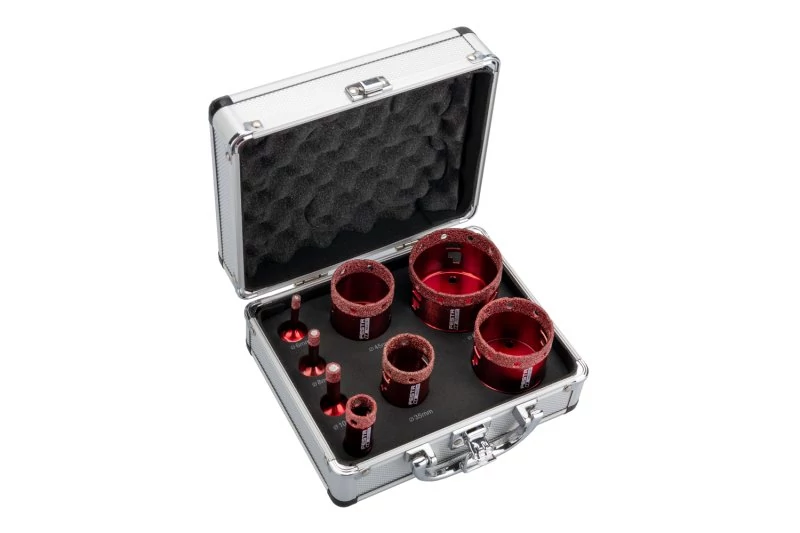 - gyémánt fúró/lekerekítő fúrófejek készlete a leggyakrabban használt átmérőkkel, például - zuhanykabinok rögzítéséhez, lyukak lekerekítéséhez vízbemenetekhez, szennyvízcsövekhez vagy vezetékdobozokhoz.