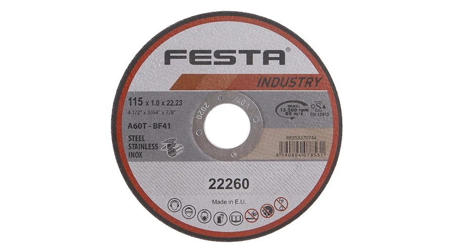 Professzionális vágótárcsa fémhez, öntöttvashoz, ROZSDAMENTES ACÉLHOZ, EURÓPÁBAN A FESTA INDUSTRY tárcsacsalád a nevéből adódóan kifejezetten professzionális használatra készült, a minőséget valódi, a vágások számát és sebességét vizsgáló tesztek igazolják. Szemcsetípus - KORUND, kötőanyag - aldehid alapú műgyanták, kivitel - EGYENES, max. fordulatszám - 80 m/s, megengedett fordulatszám - 12200 ford./perc, ERŐSÍTÉSRE KETTŐRÉTEGŰ ÜVEGVEL! A FESTA INDUSTRY TÁRCSAI MEGFELELnek az EN 12413-nak és az OSA homologizációnak!