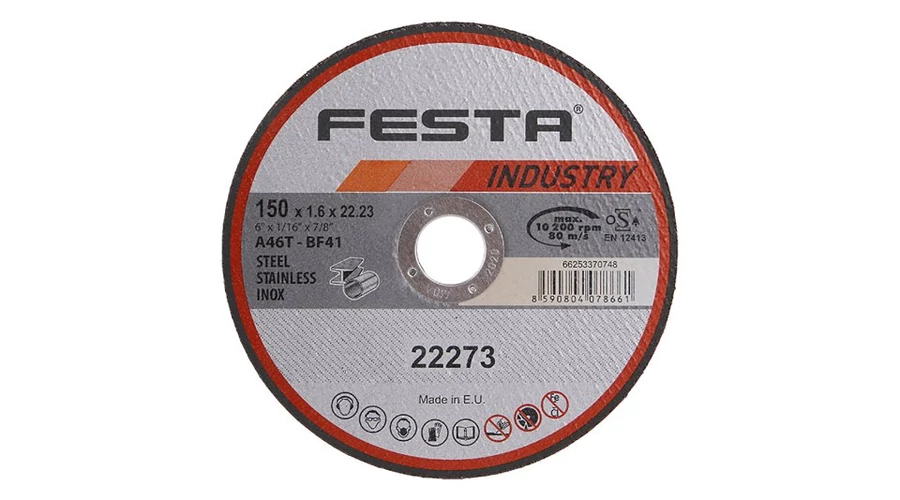 Professzionális vágótárcsa fémhez, öntöttvashoz, ROZSDAMENTES ACÉLHOZ. Az EURÓPÁBAN gyártott FESTA INDUSTRY tárcsacsalád, ahogy a név is sugallja, kifejezetten professzionális használatra készült, a minőséget valódi, a vágásszámra és sebességre összpontosító tesztekkel igazolják. Szemcsetípus - KORUND, kötőanyag - aldehid alapú műgyanták, kivitel - EGYENES, max. fordulatszám - 80 m/s, megengedett fordulatszám - 12200 ford./perc, ERŐSÍTÉSRE KETTŐRÉTEGŰ ÜVEGVEL! A FESTA INDUSTRY TÁRCSAI MEGFELELnek az EN 12413-nak és az OSA homologizációnak!