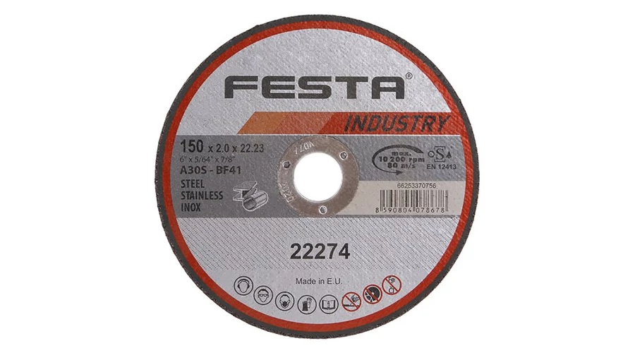 Professzionális vágótárcsa fémhez, öntöttvashoz, ROZSDAMENTES ACÉLHOZ. Az EURÓPÁBAN gyártott FESTA INDUSTRY tárcsacsalád, ahogy a név is sugallja, kifejezetten professzionális használatra készült, a minőséget valódi, a vágásszámra és sebességre összpontosító tesztekkel igazolják. Szemcsetípus - KORUND, kötőanyag - aldehid alapú műgyanták, kivitel - EGYENES, max. fordulatszám - 80 m/s, megengedett fordulatszám - 12200 ford./perc, ERŐSÍTÉSRE KETTŐRÉTEGŰ ÜVEGVEL! A FESTA INDUSTRY TÁRCSAI MEGFELELnek az EN 12413-nak és az OSA homologizációnak!