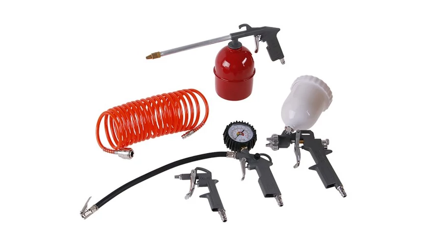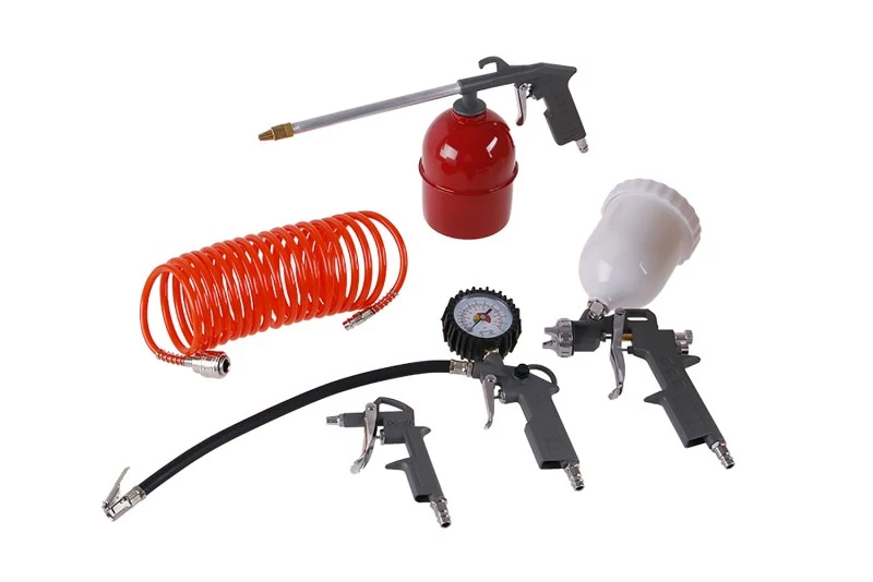 A kompresszorkészlet egy nyomásmérővel ellátott felfújható pisztolyból áll - a sűrített levegővel való könnyű feltöltéshez (pl. autók, kerékpárok abroncsai stb.), egy szórópisztoly alsó és felső töltettel - festékanyagok (lakkok, szintetikus és víz) felviteléhez -bázisú festékek) felületekre, fúvópisztoly - pl. fémpor kifújására nehezen elérhető helyekről, spiráltömlő 5m - pneumatikus szerszámok kompresszorhoz történő csatlakoztatásához. Üzemi nyomás 5 bar - max 8 bar.