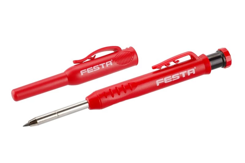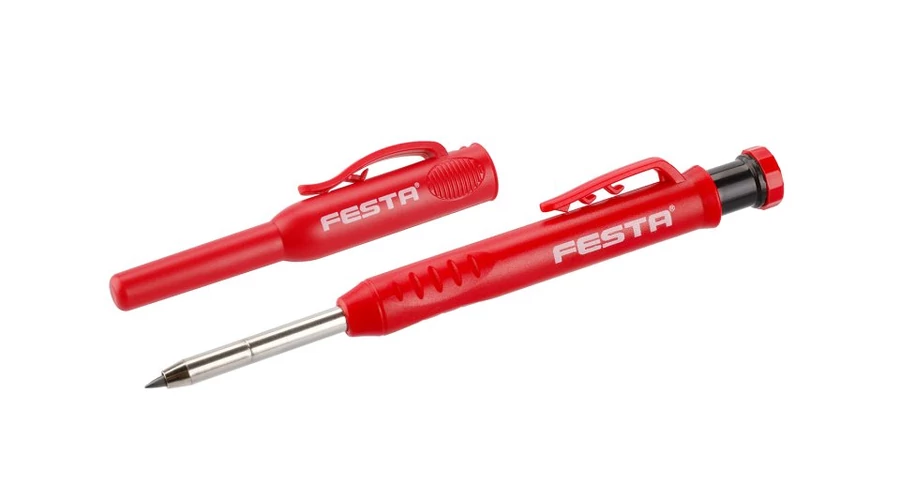 Speciális FESTA jelölő HB keménységgel. A mindössze 6 mm átmérőjű kialakítás pontos jelölést tesz lehetővé nehezen hozzáférhető helyeken is. A felső rész megnyomásával könnyen mozgatható a betét, a végén beépített hegyezővel.