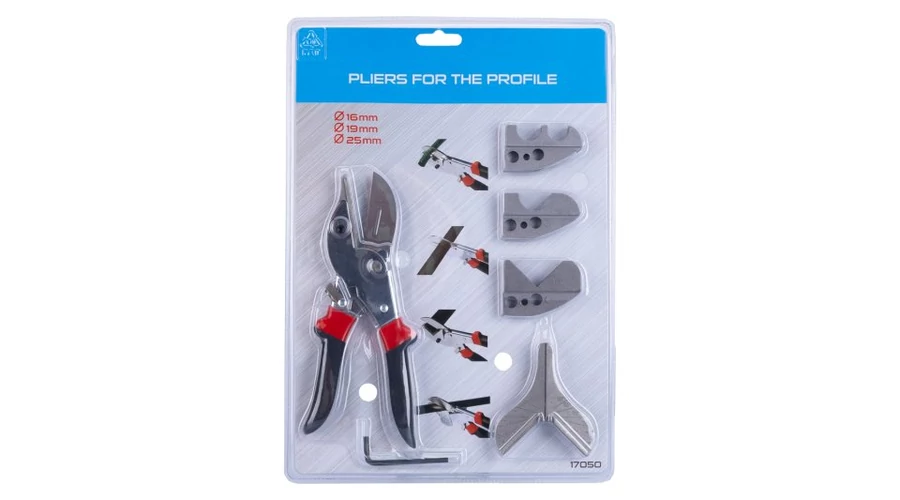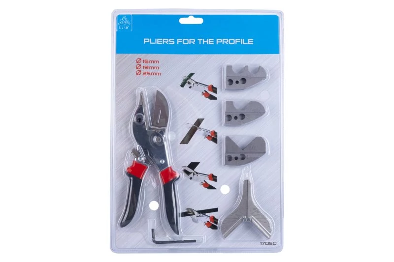 Fogó PVC lécekhez és csövekhez, fogó edzett pengével és cserélhető pofákkal, állítható szögű PVC lécek és PVC csövek vágásához, ergonomikus fogantyúk, buborékfólia.