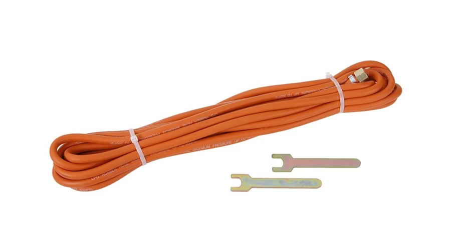 - a tömlő mindkét oldalán G 3/8" menettel van felszerelve az égőhöz és a redukciós szelepen keresztül a bombához való csatlakozáshoz - lásd a képen kapcsolási rajz