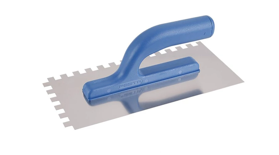 Rozsdamentes fogazott simító FESTA 280x130 mm, e10 fog, műanyag nyéllel, lemezvastagság 0,8 mm. Elsősorban csempék és burkolatok alá ragasztók felhordására, valamint esztrichek, stukkó, vakolatok, tömítőanyagok és egyéb építőanyagok felhordására használják. A rozsdamentes fogazott simító lehetővé teszi a ragasztó vagy építőanyag nyújtását csíkokban és a simító fogának megfelelő magasságban.