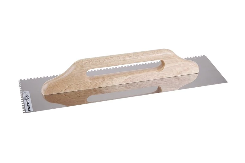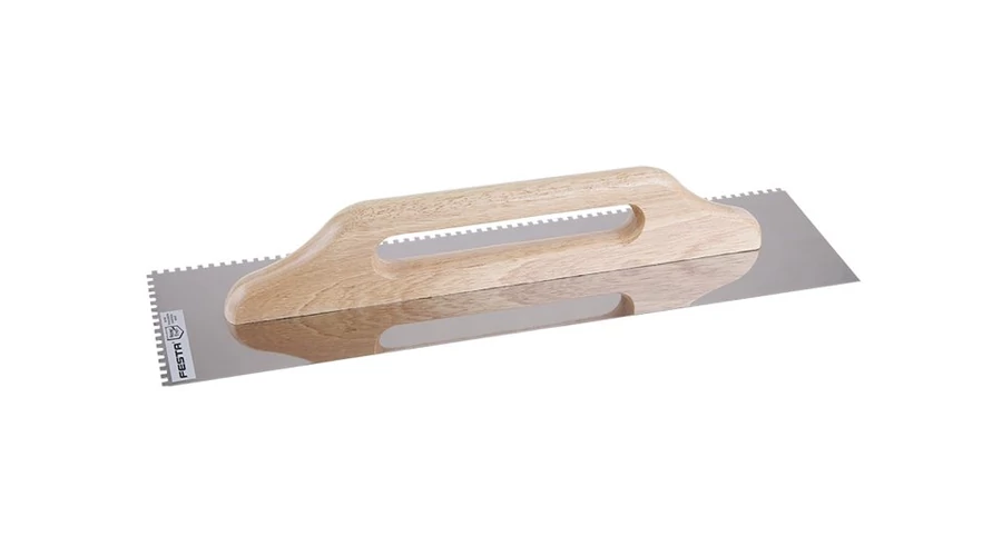Rozsdamentes fogazott simító FESTA 500x130 mm, e4 fog, fa nyéllel, lemezvastagság 0,7 mm. Elsősorban csempék és burkolatok alá ragasztók felhordására, valamint esztrichek, stukkó, vakolatok, tömítőanyagok és egyéb építőanyagok felhordására használják. A rozsdamentes fogazott simító lehetővé teszi a ragasztó vagy építőanyag nyújtását csíkokban és a simító fogának megfelelő magasságban.