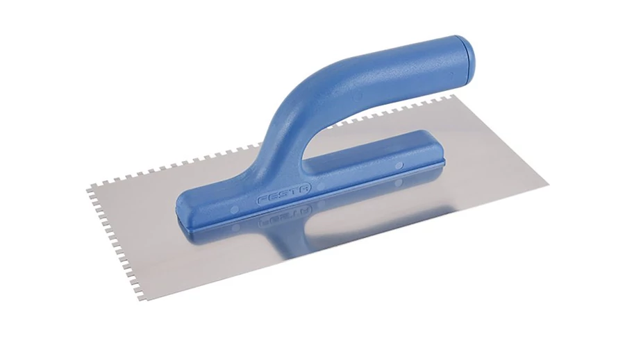 Rozsdamentes fogazott simító FESTA 280x130 mm, e4 fog, műanyag nyéllel, lemezvastagság 0,8 mm. Elsősorban csempék és burkolatok alá ragasztók felhordására, valamint esztrichek, stukkó, vakolatok, tömítőanyagok és egyéb építőanyagok felhordására használják. A rozsdamentes fogazott simító lehetővé teszi a ragasztó vagy építőanyag nyújtását csíkokban és a simító fogának megfelelő magasságban.
