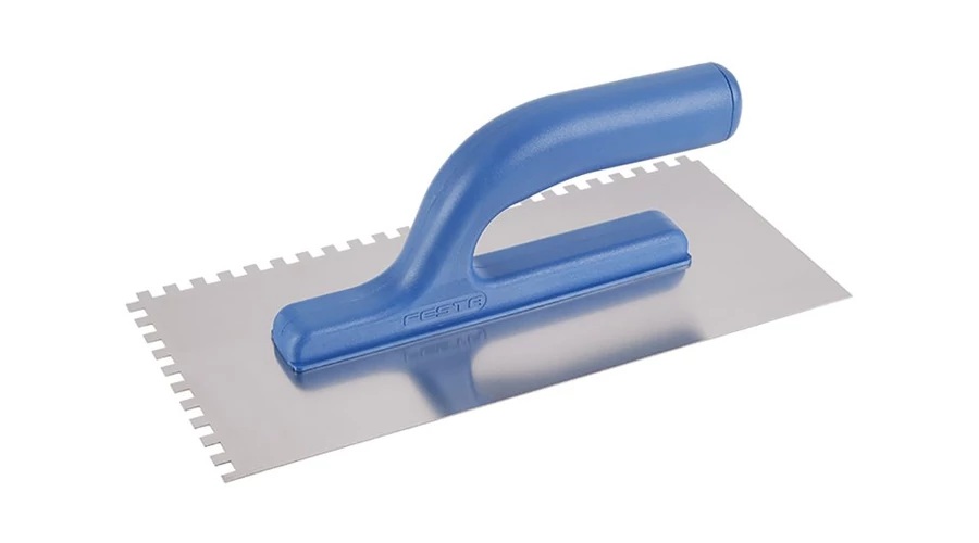 Rozsdamentes fogazott simító FESTA 280x130 mm, e6 fogú, műanyag nyéllel, lemezvastagság 0,8 mm. Elsősorban csempék és burkolatok alá ragasztók felhordására, valamint esztrichek, stukkó, vakolatok, tömítőanyagok és egyéb építőanyagok felhordására használják. A rozsdamentes fogazott simító lehetővé teszi a ragasztó vagy építőanyag nyújtását csíkokban és a simító fogának megfelelő magasságban.