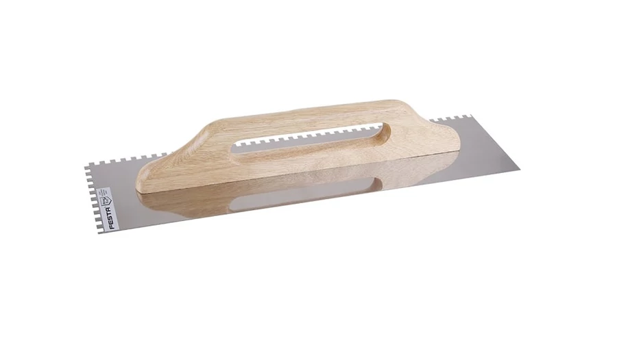Rozsdamentes fogazott simító FESTA 500x130 mm, e6 fog, fa nyéllel, lemezvastagság 0,7 mm. Elsősorban csempék és burkolatok alá ragasztók felhordására, valamint esztrichek, stukkó, vakolatok, tömítőanyagok és egyéb építőanyagok felhordására használják. A rozsdamentes fogazott simító lehetővé teszi a ragasztó vagy építőanyag nyújtását csíkokban és a simító fogának megfelelő magasságban.