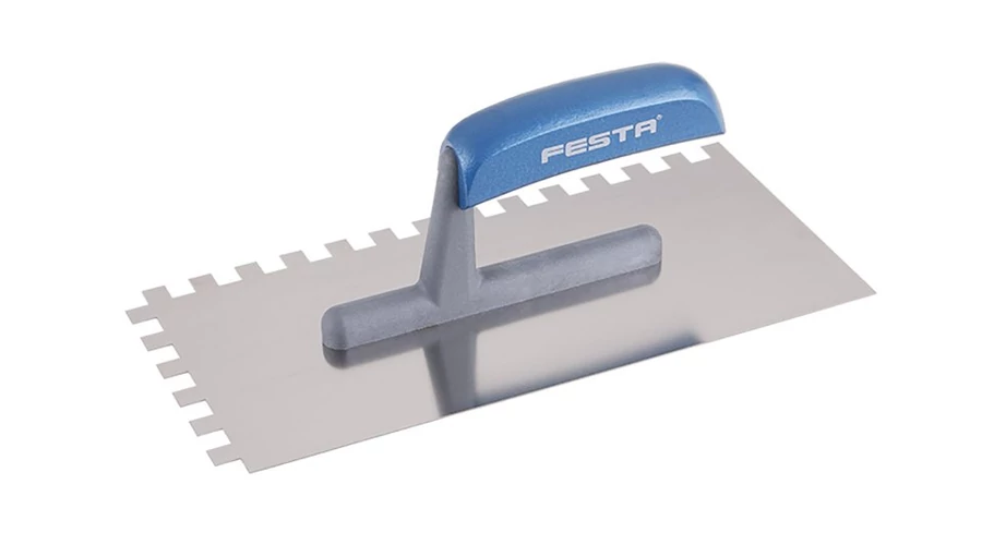 Rozsdamentes fogazott simító FESTA 280x130 mm, e10 fog, fa lakkozott nyéllel, lapvastagság 0,8 mm. Elsősorban csempék és burkolatok alá ragasztók felhordására, valamint esztrichek, stukkó, vakolatok, tömítőanyagok és egyéb építőanyagok felhordására használják. A rozsdamentes fogazott simító lehetővé teszi a ragasztó vagy építőanyag nyújtását csíkokban és a simító fogának megfelelő magasságban.