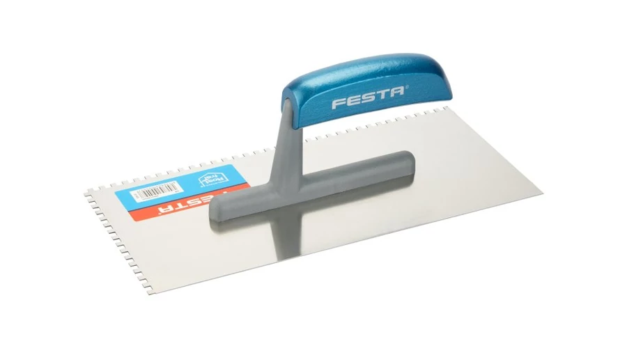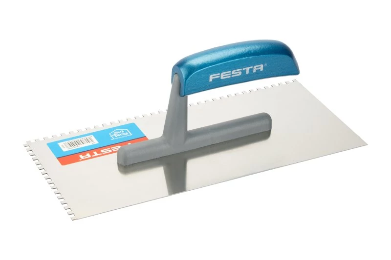 Rozsdamentes fogazott simító FESTA 280x130 mm, e4 fog, fa lakkozott nyéllel, lapvastagság 0,8 mm. Elsősorban csempék és burkolatok alá ragasztók felhordására, valamint esztrichek, stukkó, vakolatok, tömítőanyagok és egyéb építőanyagok felhordására használják. A rozsdamentes fogazott simító lehetővé teszi a ragasztó vagy építőanyag nyújtását csíkokban és a simító fogának megfelelő magasságban.