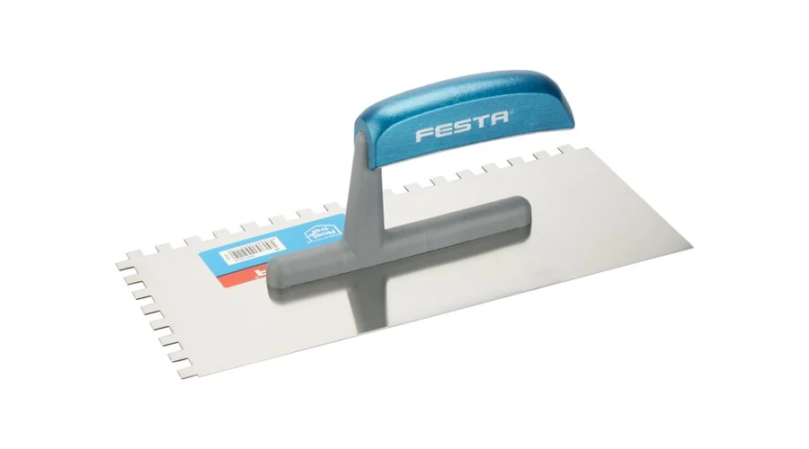 Rozsdamentes fogazott simító FESTA 280x130 mm, e8 fog, fa lakkozott nyéllel, lapvastagság 0,8 mm. Elsősorban csempék és burkolatok alá ragasztók felhordására, valamint esztrichek, stukkó, vakolatok, tömítőanyagok és egyéb építőanyagok felhordására használják. A rozsdamentes fogazott simító lehetővé teszi a ragasztó vagy építőanyag nyújtását csíkokban és a simító fogának megfelelő magasságban.